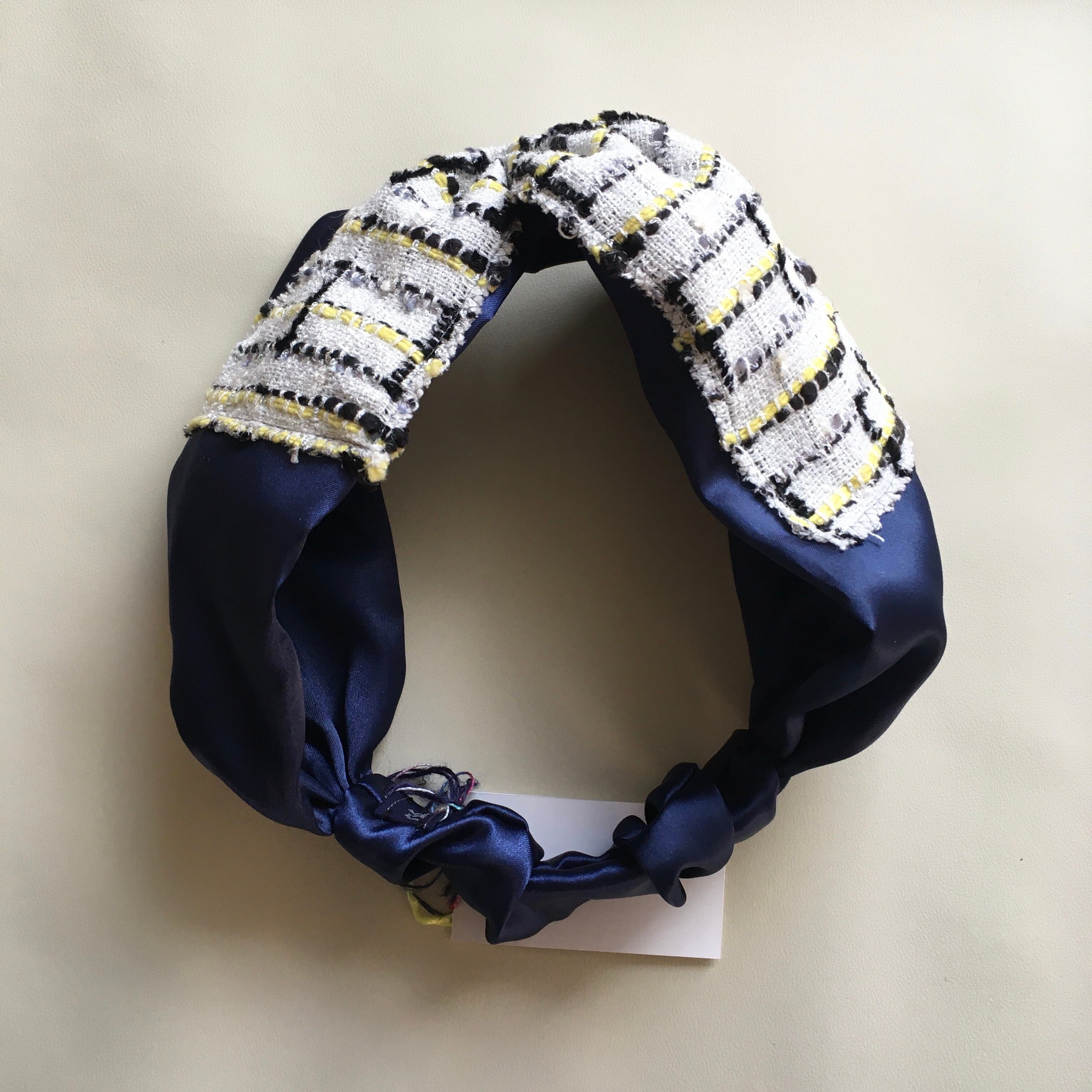 リントンツイードのヘアバンド(ホワイトイエローチェック×ネイビー)