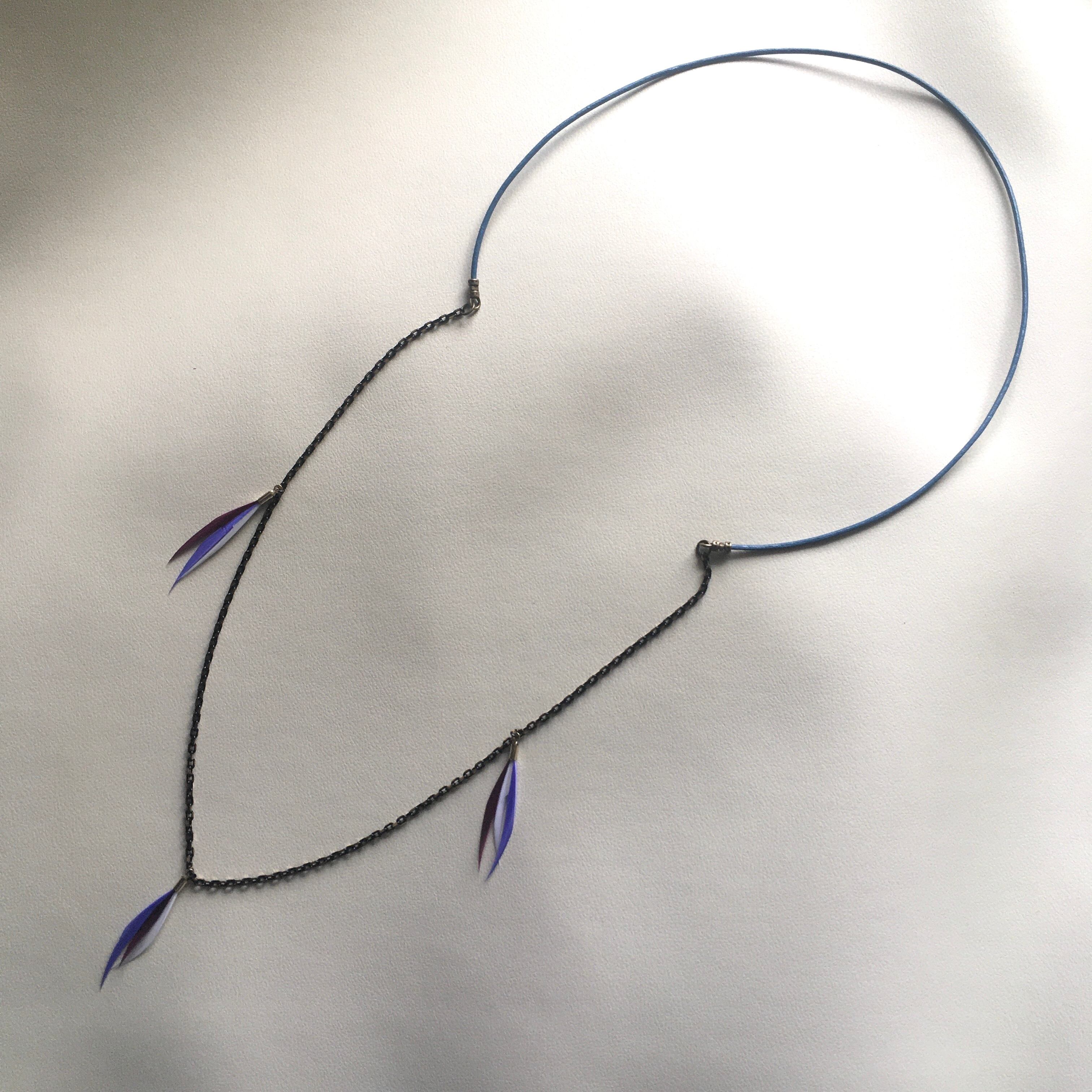 国産皮革とチェーン、フェザーの尾羽をデザインカットし組み合わせた一品