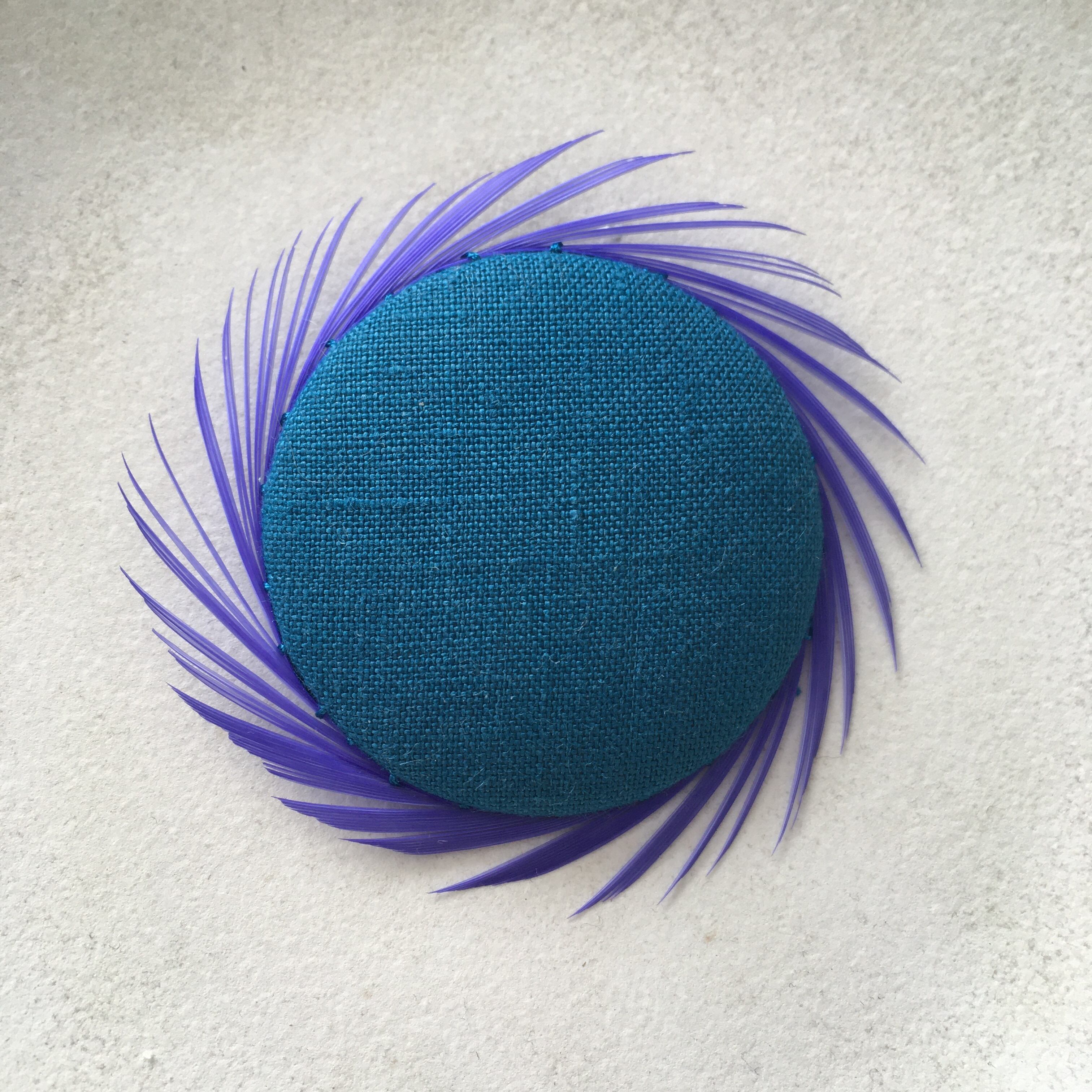 ガチョウの尾羽であるフェザーを周りに縫い込みシンプルに仕上げたブローチ