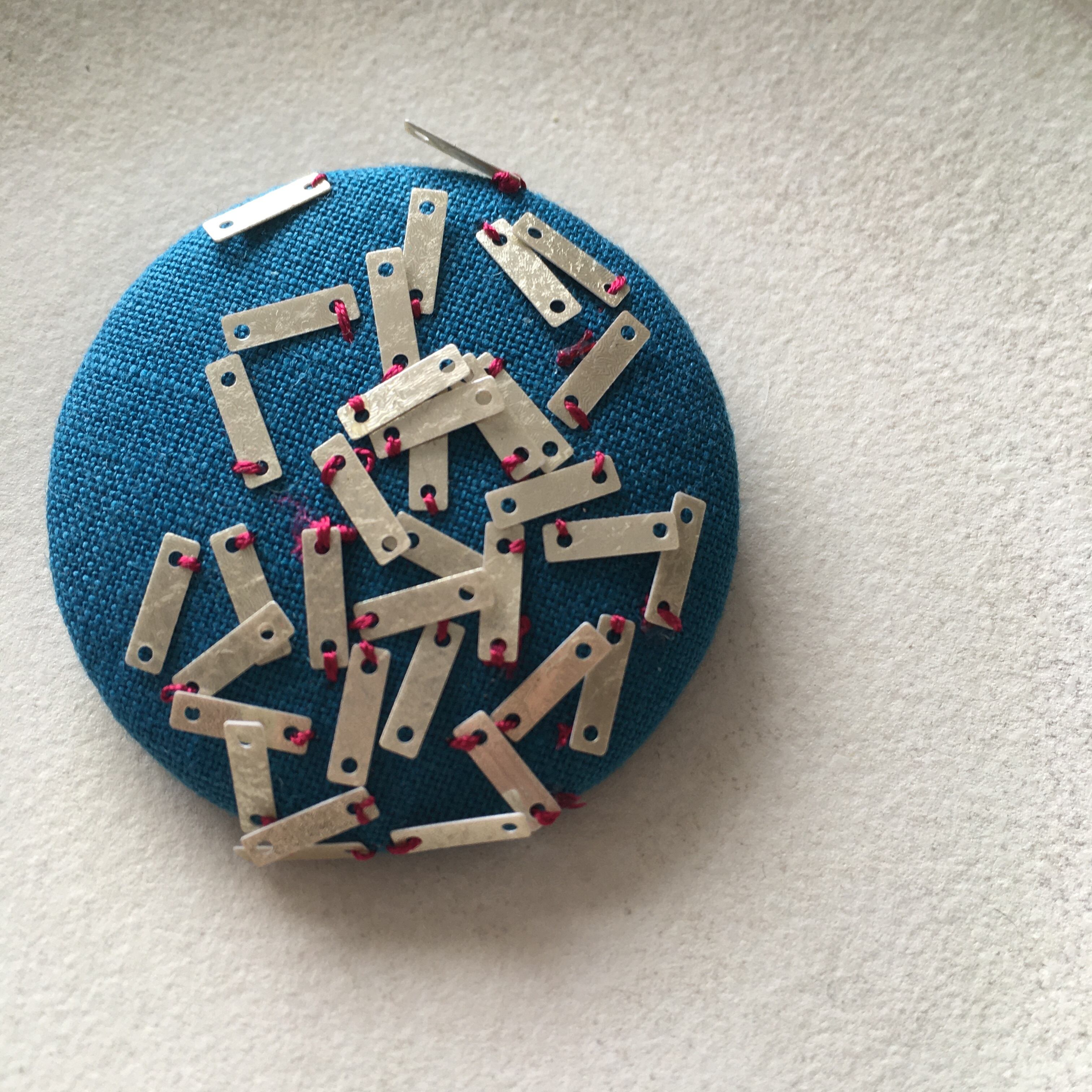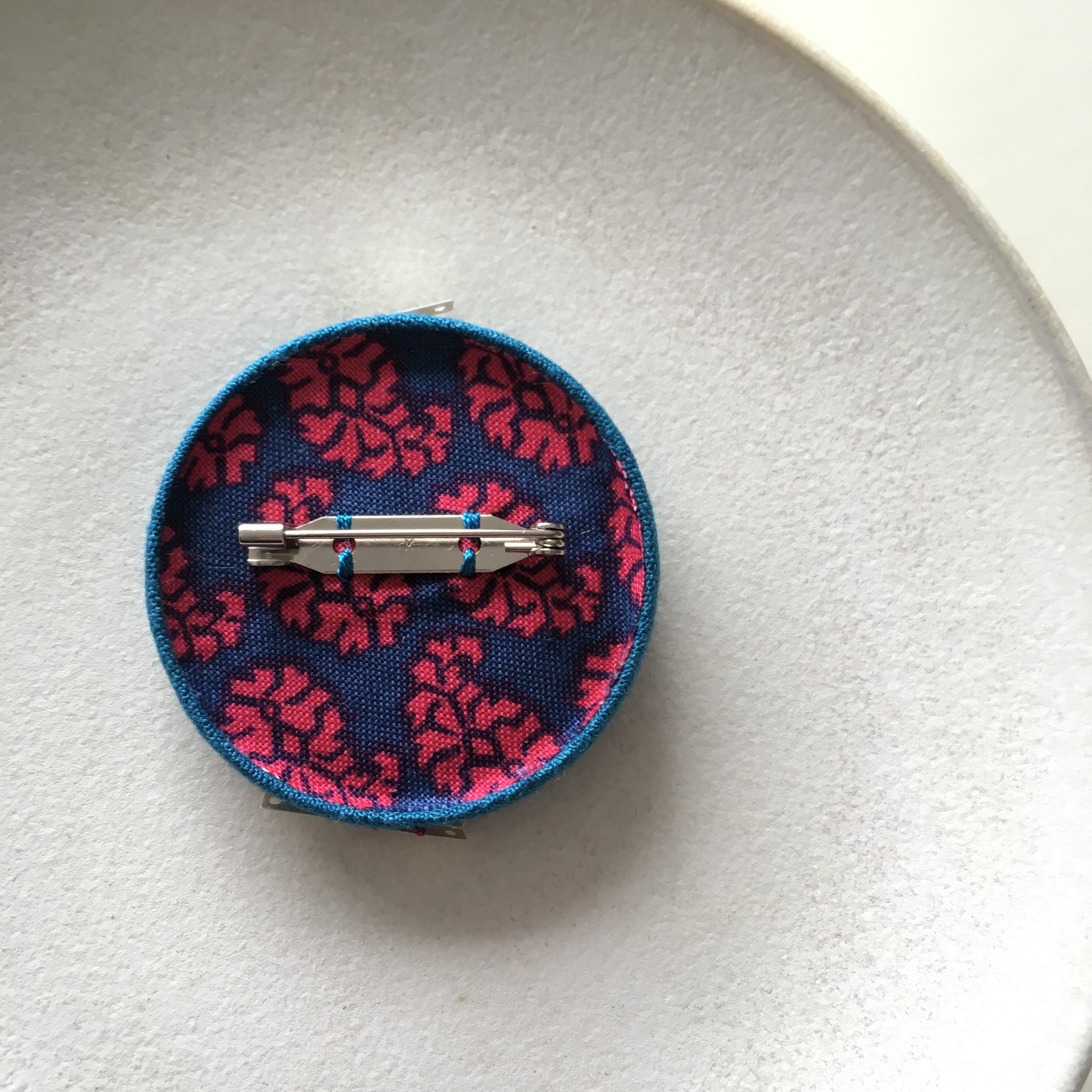 素材:スパンコール、麻生地(リネン100%)、ボタン枠、キルト芯、ブローチピン