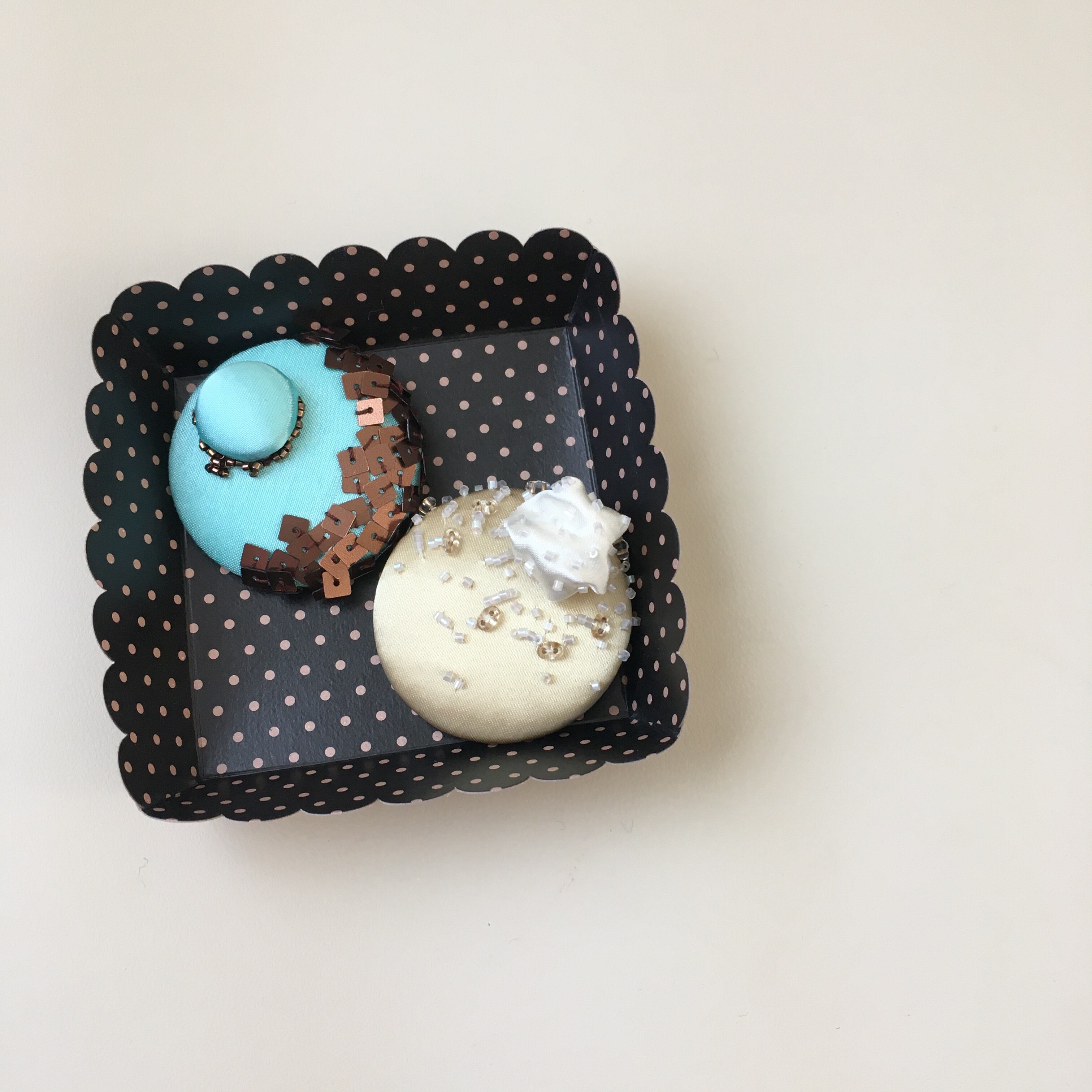 素材:サテン生地(ポリエステル100%)、ビーズ、スパンコール、ボタン枠、キルト芯、糸、ブローチピン