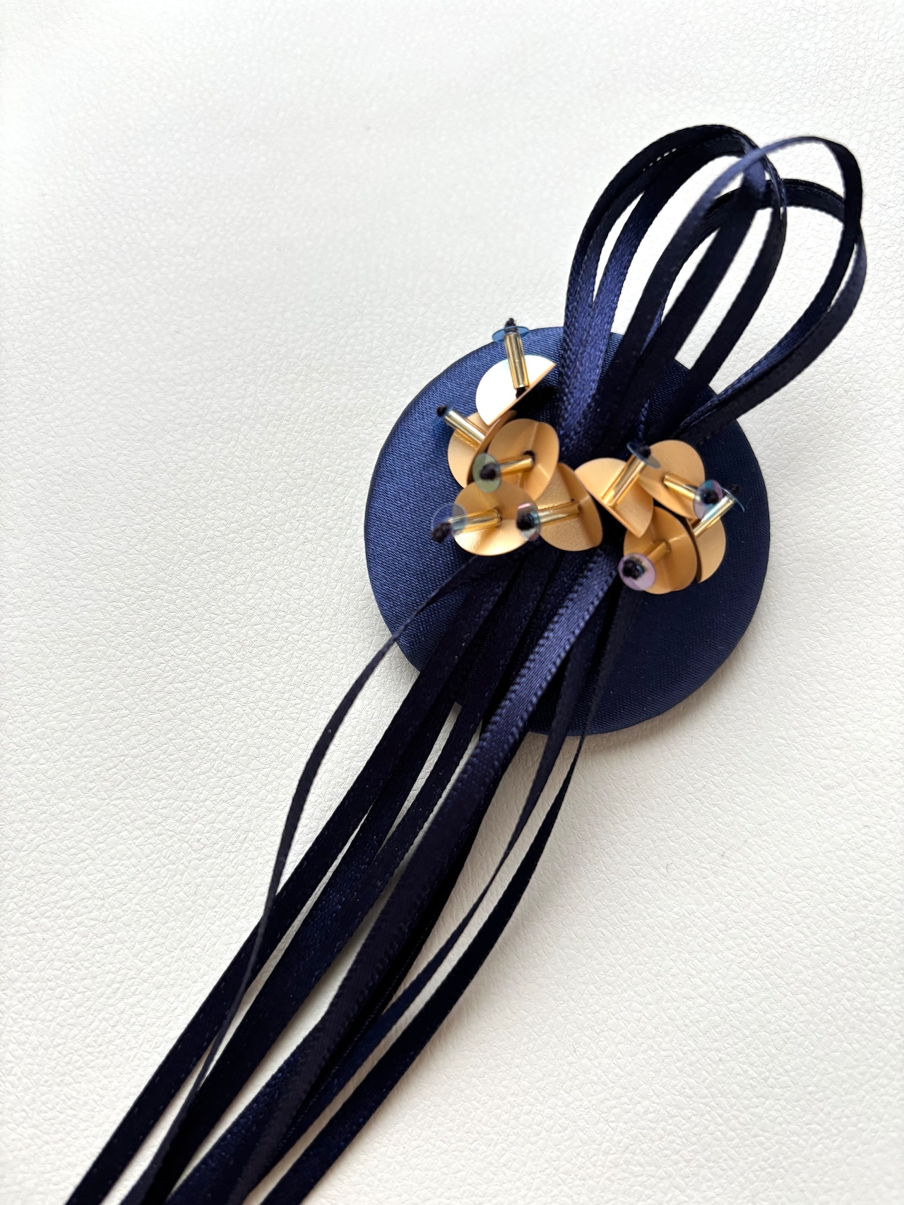 ネイビーカラーの生地とリボンを組み合わせ、スパンコールで仕上げた個性的なデザイン